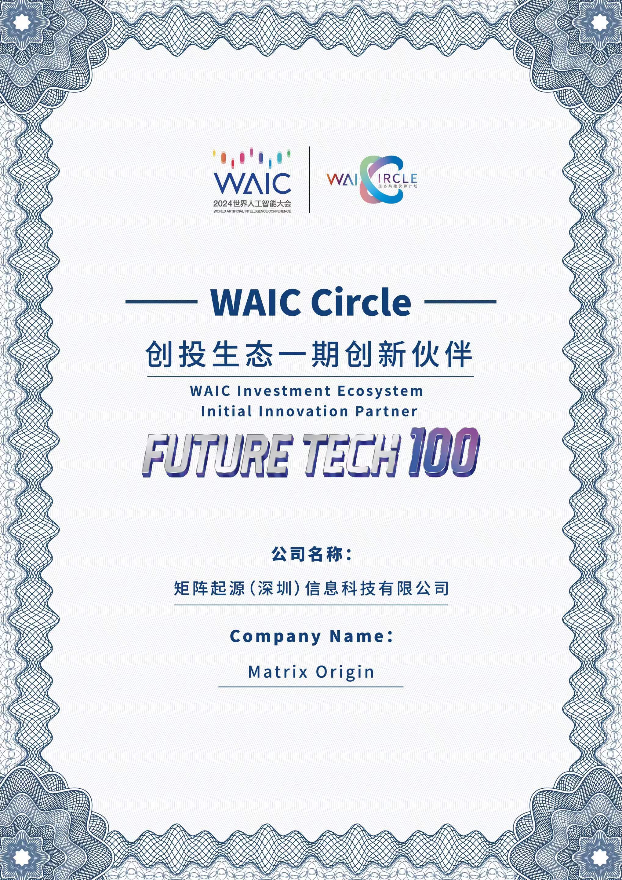 From July 4th to 7th, 2024, the globally anticipated 2024 World Artificial Intelligence Conference and High-Level Conference on Global AI Governance (WAIC 2024) was grandly held in Shanghai. The Future Tech 100 Innovation Incubation Exhibition once again became the focus of the conference. It was not only a showcase of technological achievements but also a gathering of global innovation forces. Future Tech 100 covered multiple cutting-edge directions in the AI field. These projects represented the latest developments in AI technology and heralded new directions for the future of artificial intelligence MatrixOrigin was invited to participate in this conference and was honored with the "FUTURE TECH100—Innovation Partner of the First Phase of the Venture Capital Ecosystem."